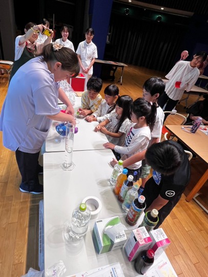 臨床技術学科の2年生と3年生が丁寧にサポートし、子供たちは楽しそうに実験していました。