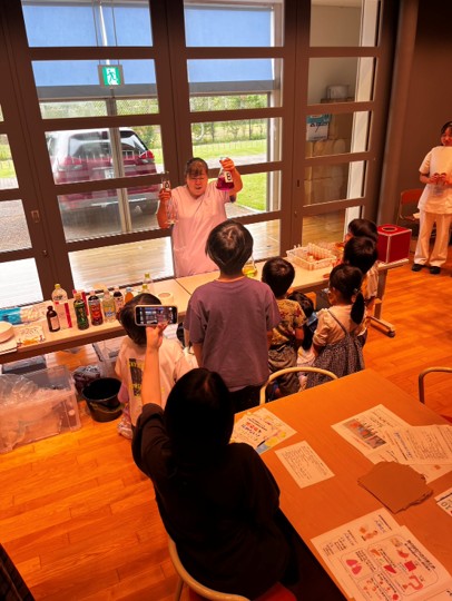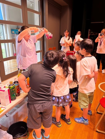 おくすりを飲むときはどうして、ジュースやお茶で飲んではいけないのか?を体験しました。薬をいれると緑茶と紅茶は一瞬で真っ黒になり、子供たちは、え~なんで!と、びっくりしていました。