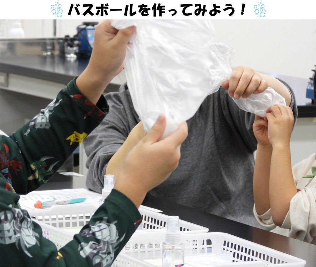 また、おまけの実験として、おうちで使えるバスボール(おもちゃ入り!)を1人1個ずつ作成いたしました。